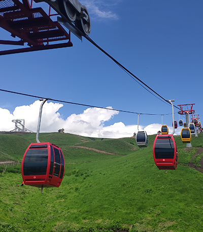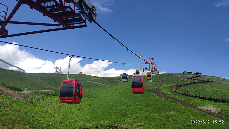 固定抱索器吊廂索道具有方便、高性價比等特點。吊箱采用封閉式,常用配置選擇2人吊箱、4人吊廂。其工作原理是一條閉合的運載索套在索道兩端的驅(qū)動輪及迂回輪上,線路中間設有支架,支架上裝有托索輪或壓索輪組,隨地形變化將運載索托起或壓下,按一定間距將吊廂用抱索器固結(jié)在運載鋼索上,動力驅(qū)動輪帶動載索,迂回輪實現(xiàn)線路往返來實現(xiàn)運送乘客的目的。2人廂和4人廂索道是景區(qū)觀光交通的性價比高的理想產(chǎn)品,索道的建設和維護成本相對較低。適合旅游開發(fā)投資前期。固定抱索器的2廂和4人廂索道線路速度和站內(nèi)速度相對一致,線速度可站內(nèi)控制變頻調(diào)速。根據(jù)廂配置,2人廂線路速度可達1米/秒,4人廂的線路速度可達0.8米/秒,乘客乘坐須站內(nèi)工作人員手動開關(guān)門廂門。2人廂和4人廂的選擇,可根據(jù)不同的線路和高差來配置廂的運量和個數(shù),以滿足客戶運營者和使用者的需求。